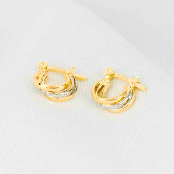 Candonga bicolor en oro laminado 18k, combinación de dos tonos de oro con 9 mm de diámetro. Su contraste sutil la hace única, ideal para quienes buscan elegancia y exclusividad en una joya versátil y moderna.