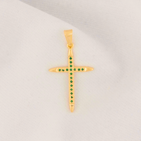 Dije en forma de cruz con punta y puntos de esmeralda de 2.1mm, elaborado en oro laminado 18k. Su diseño delicado fusiona lo espiritual con la elegancia moderna. Perfecto para quienes valoran la fe y el estilo.
